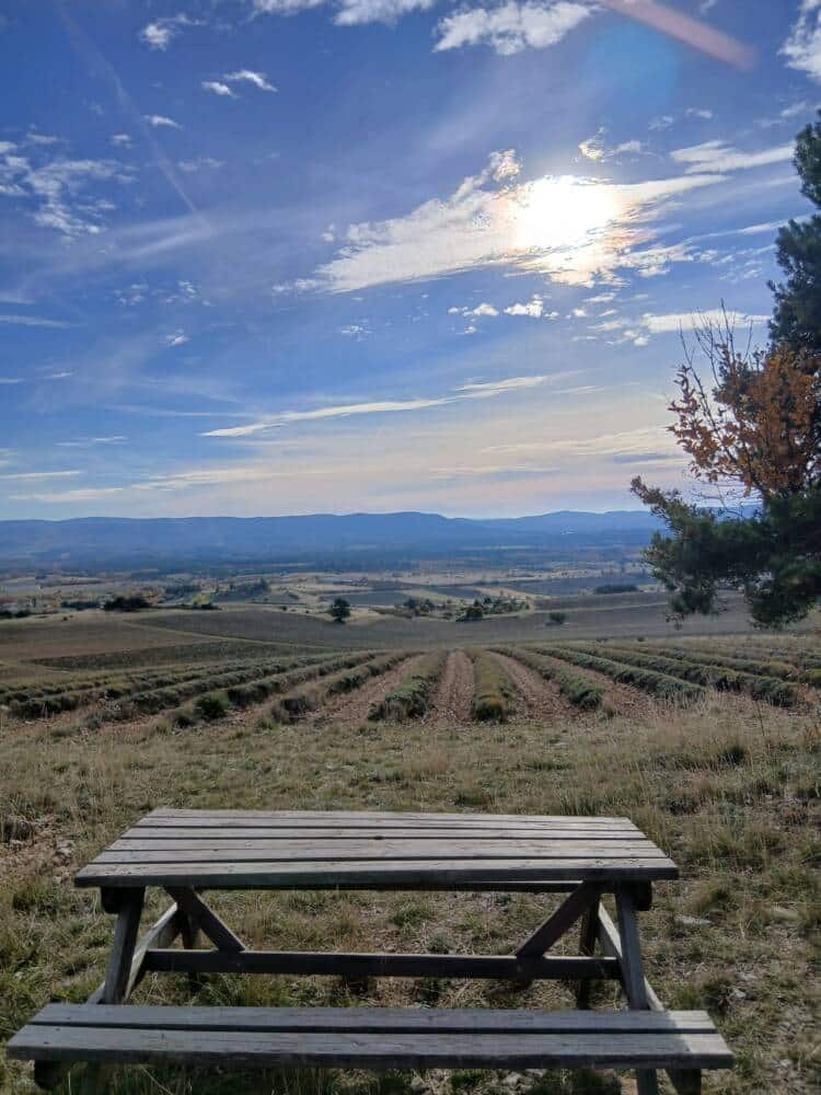 Départ à seulement 1,5 km du village, avec parking à proximité de la distillerie du Vallon, que l’on peut visiter selon la saison*. Tout au long de la promenade, le panorama s’ouvre sur les plateaux cultivés, les collines de Provence et les crêtes du Ventoux en toile de fond. Un itinéraire sensoriel où l’on prend le temps de respirer, observer et s’émerveiller.
